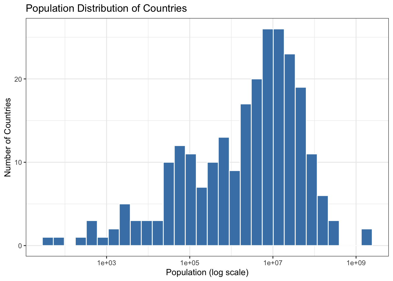 library(ggplot2)# Example: Visualize population distributionggplot(data = countries_data, aes(x = population)) +geom_histogram(bins =30, fill ="steelblue", color ="white") +scale_x_log10() +# Log scale for better visualizationlabs(title ="Population Distribution of Countries",x ="Population (log scale)",y ="Number of Countries") +theme_bw()