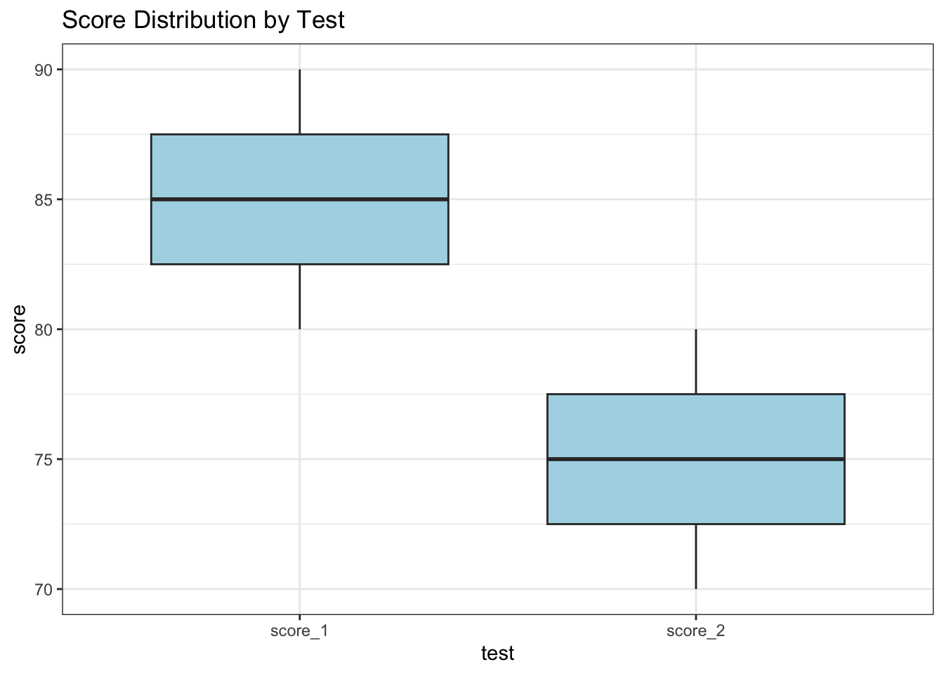 library(ggplot2)# Visualize the distribution of scoresggplot(long_data, aes(x = test, y = score)) +geom_boxplot(fill ="lightblue") +labs(title ="Score Distribution by Test") +theme_bw()