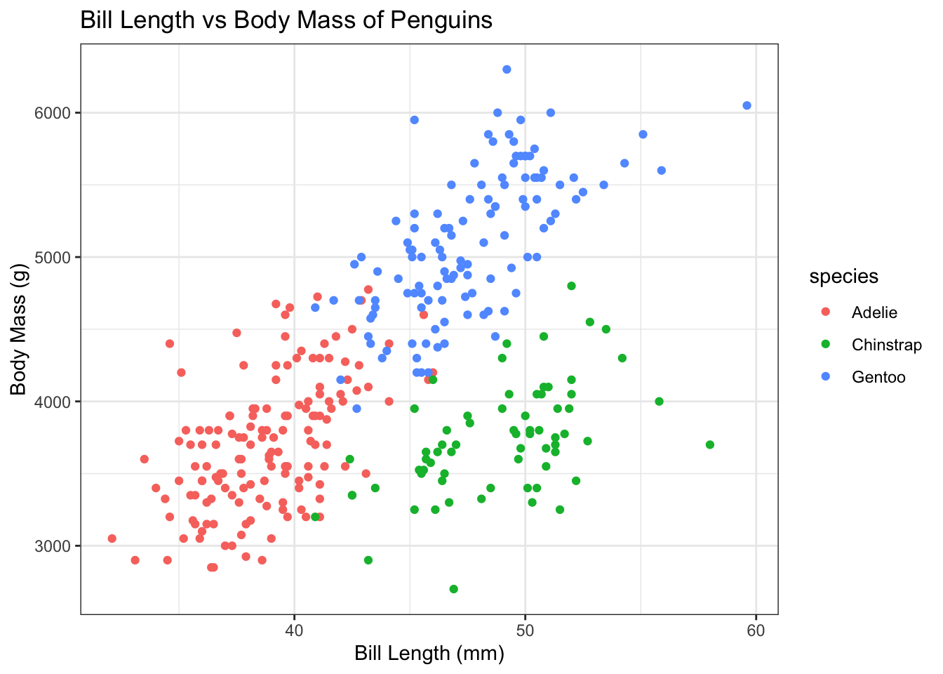 # Data cleaning: Remove rows with NA valuescleaned_penguins <-na.omit(penguins)# Exploratory analysis: Visualize bill length vs. body mass by speciesggplot(cleaned_penguins, aes(x = bill_length_mm, y = body_mass_g, color = species)) +geom_point() +labs(title ="Bill Length vs Body Mass of Penguins",x ="Bill Length (mm)",y ="Body Mass (g)") +theme_bw()