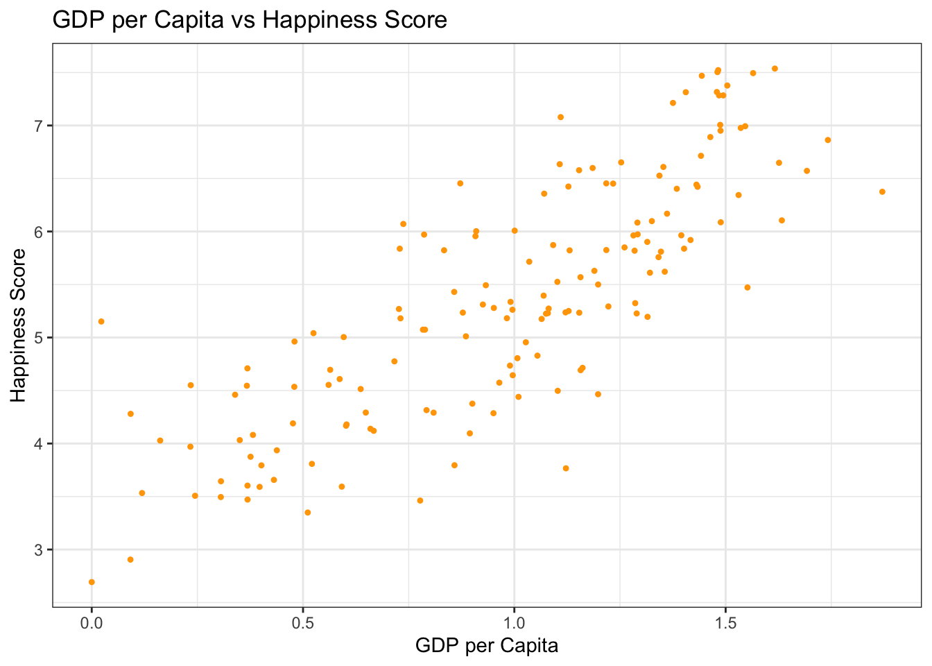 # Exploratory analysis: Scatter plot of GDP vs Happiness Scoreggplot(happiness_data, aes(x = GDP.per.capita, y = Happiness.Score)) +geom_point(pch=20, color ="orange") +labs(title ="GDP per Capita vs Happiness Score",x ="GDP per Capita",y ="Happiness Score") +theme_bw()